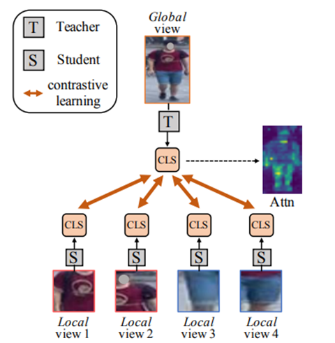 - 그러나, 기존 SSL 방법들은 classification task에 사용하는 방식을 그대로 적용하는 경우가 대부분이고, 이는 앞서 언급한 classification과 retrieval (ReID)의 task 차이를 고려하지 못한 방법임. 그림 1은 DINO에서의 학습 방식인데, Global feature과 Local feature를 같게 만드는 방식으로 훈련됨. 이 과정에서 Local view 1,2의 빨간색 상의와 Local view 3,4의 파란색 바지가 같은 feature를 나타내도록 학습되는데, 이것은 매우 unreasonable함. 이때문에 서로 다른 local view간 shared feature만 주로 학습되고, 많은 local detail이 사라지게 됨.