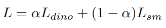 위의 식으로 진행되며, dino loss는 DINO에서 제안된 Distillation loss라고 보시면 되고, sm Loss가 pretext task로 진행한 psuedo label과의 cross entropy loss가 되겠습니다. $\alpha$는 실험을 통해 0.5로 정해졌습니다.