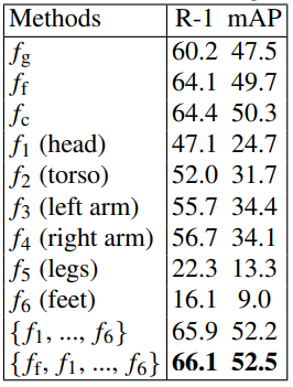 최종 Inference시에 어떤 feature를 사용하는 것이 좋은가에 대한 분석입니다. Part feature vector와 foreground mask로 얻은 global feature를 concat하여 쓰는 것이 가장 좋네요.