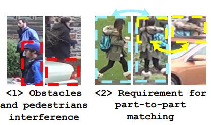 Person Re-identification (ReID)는 주어진 gallery 이미지 중 query와 같은 ID의 사람이 찍힌 이미지를 찾는 task입니다. 이 때 query와 gallery 이미지들 간의 feature distance를 구해 거리가 가까울수록 같은 ID일 확률이 높다고 여깁니다. 초기에는 global feature만 사용해 비교하는 방식을 사용했는데, 이는 다음과 같은 문제점들이 있습니다.