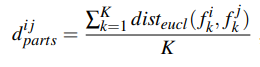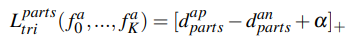 각 part feature간 거리의 평균을 낸 후, 이를 두 샘플간의 거리 $d_{parts}^{ij}$로 삼아서 Hard triplet loss를 적용하기 때문에 part feature의 조합에 해당하는 효과를 낼 수 있습니다.