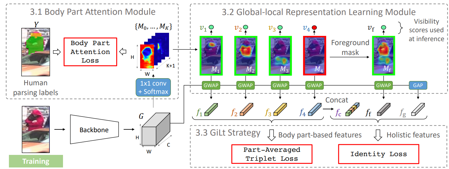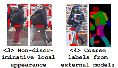 <3> 사람을 특정 부분들로 나누어 비교할 때, 분명 다른 ID의 사람이지만 부분적으로는 같은 appearance 혹은 attribute를 가진 sample들이 다수 존재합니다. 이를 Non-discriminative local appearance라고 칭하며, 기존의 ID loss (Cross entropy loss)와 triplet loss를 함께 사용하는 방식은 이에 매우 취약합니다. 따라서 이 논문에서는 이를 해결할 수 있는 학습 방법을 제시하며 이를 GiLt라고 부릅니다.
