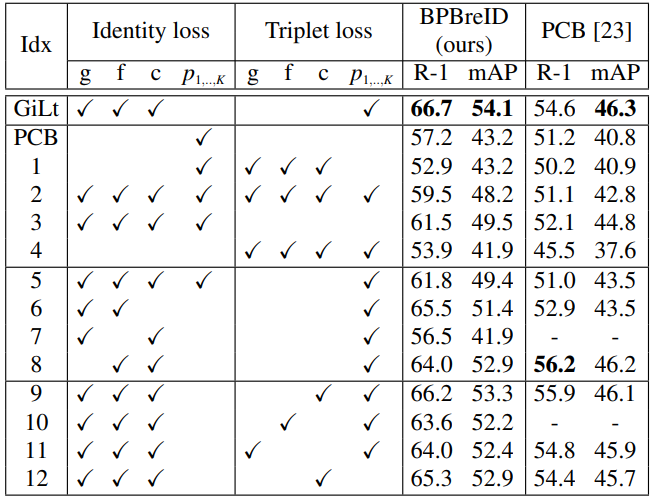 GiLt의 효용성을 증명하는 실험이고, 논문에서 제시한 것 처럼 global feature에는 ID loss만, part feature에는 triplet loss만 적용하는 것이 효과가 가장 좋습니다.