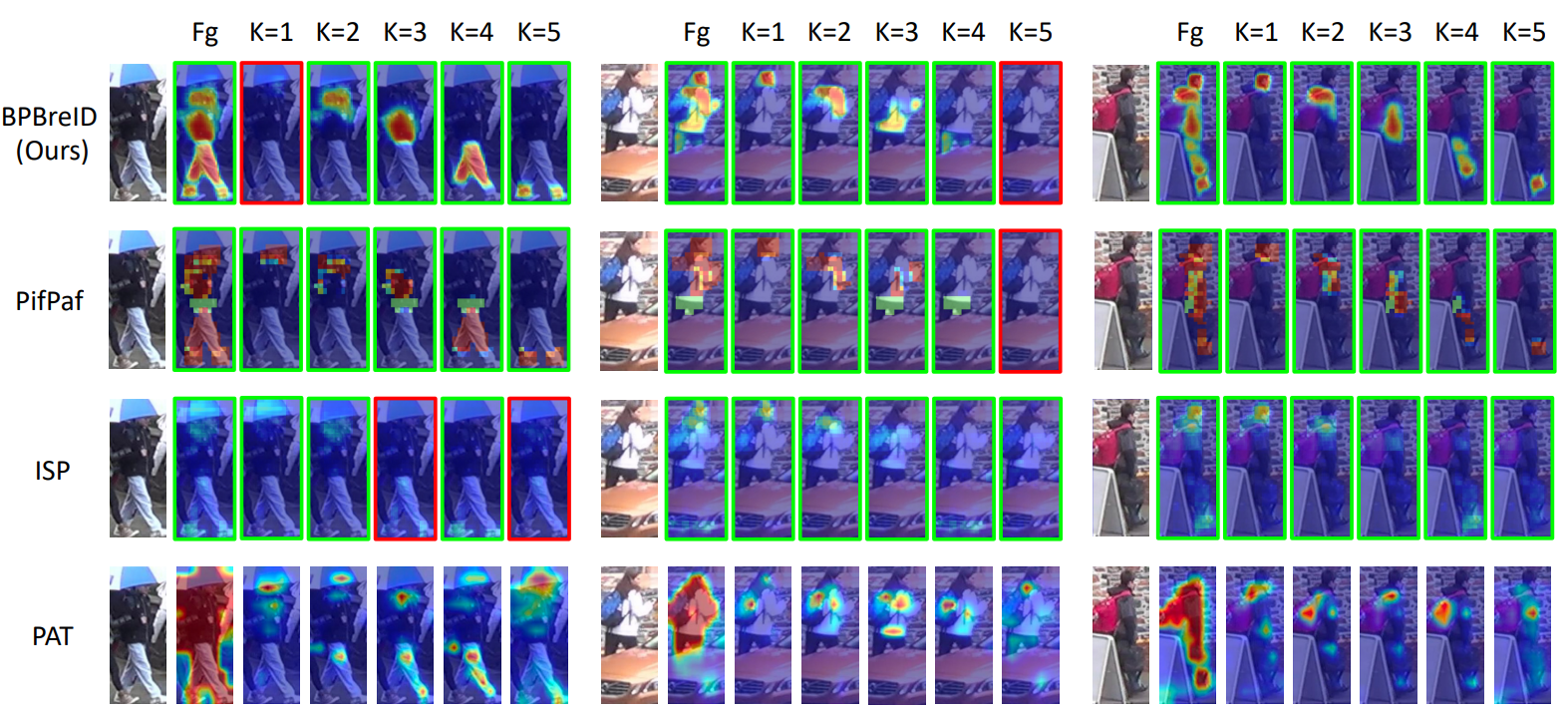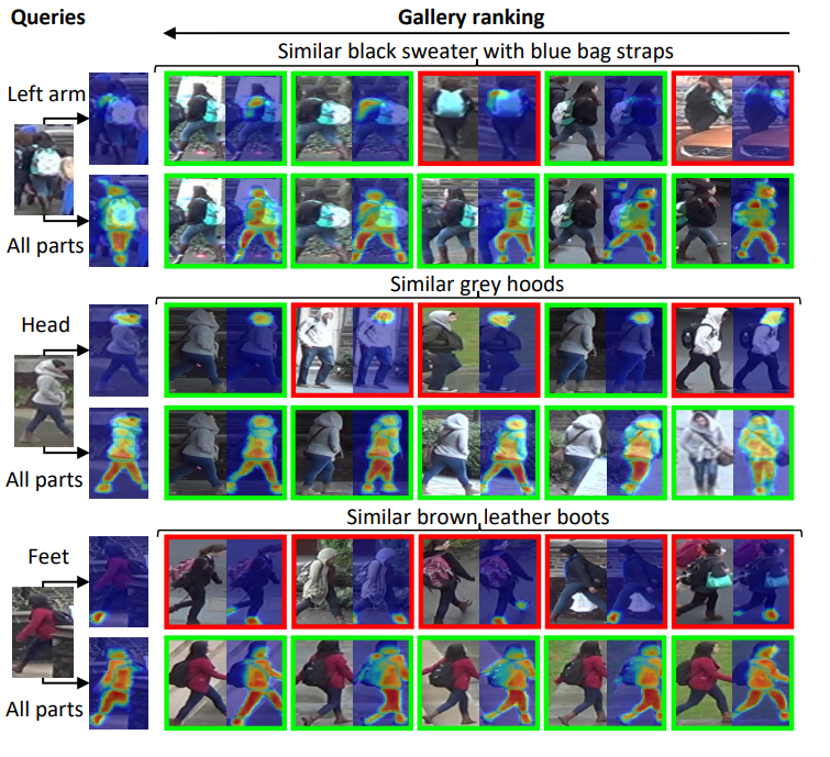 실제로 visualize해보면, 모든 부위를 고려했을 때는 알맞는 ID를 잘 찾습니다. 그러나 각 part에 대해서만 고려했을 때에는 다른 ID이더라도 비슷한 appearance를 가지면 가까운 distance를 보이며 목표에 부합하는 결과를 내는 것을 확인할 수 있습니다.