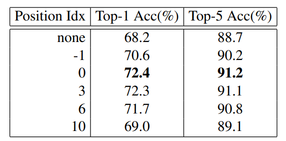 표 2는 PE strategy에 따른 성능 비교표입니다.CPE와 APE를 혼합해 사용할 때 성능이 좋음을 확인할 수가 있는데요. 이는 CPE가 token간 관계를 반영하는 PE strategy라는 점에서 RPE와 APE를 같이 사용하는 이유와 동일하다고 볼 수 있겠습니다. 또한 CPE block을 4개를 중첩해 실험한 결과도 있는데요. 이는 한 transformer block에 대해서는 PEG를 많이 쌓는다고 해서 더 의미있는 관계 정보를 뽑아낼 수 없다는 것을 증명합니다. 다만 PEG pos를 조절해 0~5번째 transformer block에 1개씩의 PEG를 사용하면 다양한 layer 에서 각자의 optimal position을 적용해 성능이 향상됨을 볼 수 있습니다.