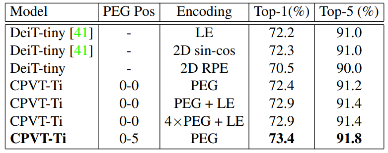 표 2를 보시면 CPVT가 SOTA 수준의 성능을 냄을 확인할 수 있습니다. 특히 Transformer 계열의 model들이 train input과 다른 size의 test input 사용시 성능이 대부분 낮아짐에도 불구하고 CPVT는 오히려 더 높은 성능을 보이고 있음을 확인할 수 있네요.