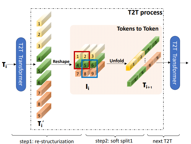 그림 2는 T2T ViT의 전체 구조도입니다. 이전 T2T block에서 출력된 token들을 re-structurization 후 soft split이란 과정을 거쳐 concat한 후 다음 T2T block으로 넣어주는 것을 확인할 수 있는데요. 각 step별로 자세히 알아보겠습니다.