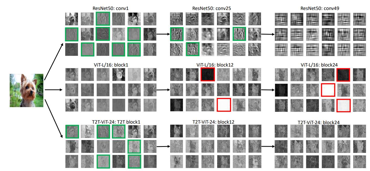 이런 단점들을 보완하기 위해서 이 논문에서는 T2T-ViT 구조를 제안합니다. 그림 1에서와 같이 ViT 기반의 structure임에도 local structure를 잘 캡쳐하고 zero feature들이 사라진 것을 확인할 수 있는데요. 자세한 방법을 다음 절에서 알아보겠습니다.