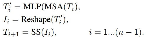 앞서 설명한대로 restructurization과 soft split이 이루어진 결과를 input으로 하여 동작하는 transformer가 바로 T2T transformer입니다. 동작을 식으로 나타내면 다음 식 2와 같겠네요. 한 module에서 $T_i$라는 input이 multi head self attention, MLP layer를 거친 후 위에서 설명한 reconstruct와 soft split을 거쳐 다음 module로 들어갑니다.